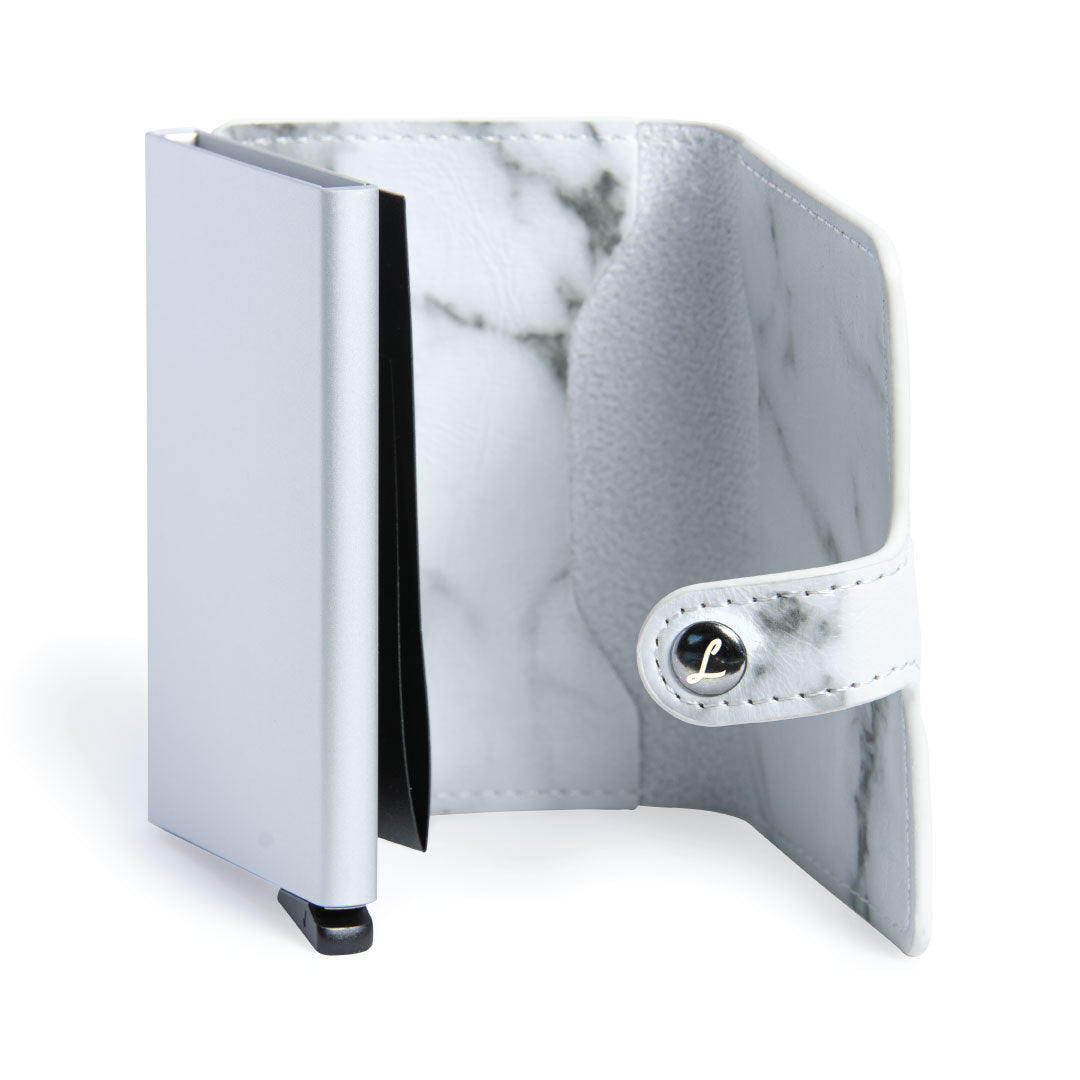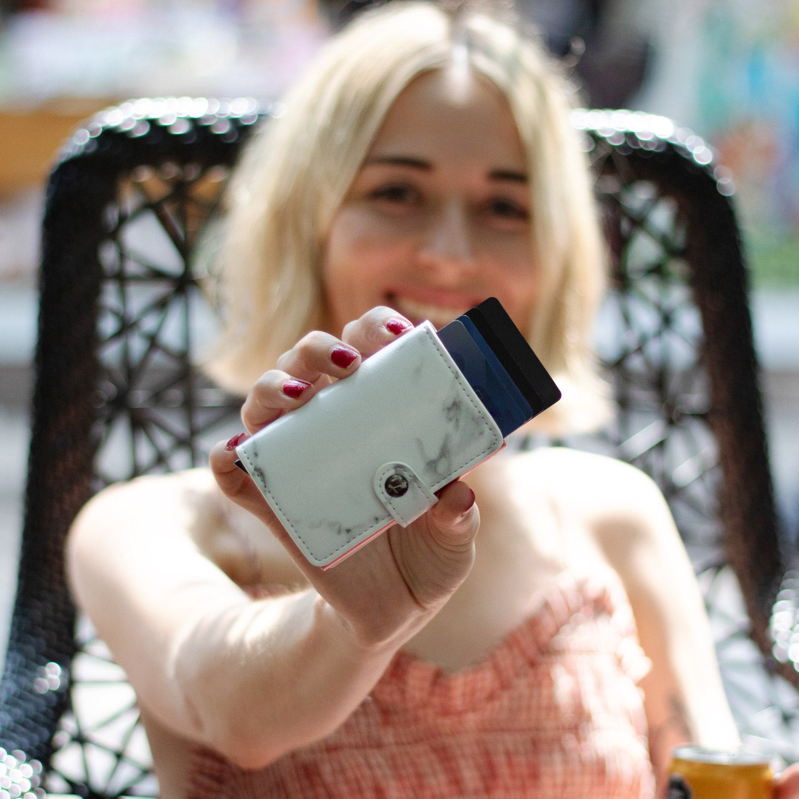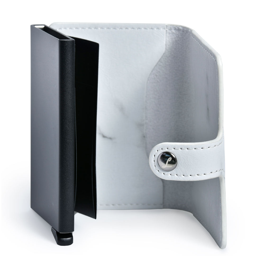Con su botón eyector, despliegas tus tarjetas al instante. No más búsquedas eternas ni billeteras desordenadas.